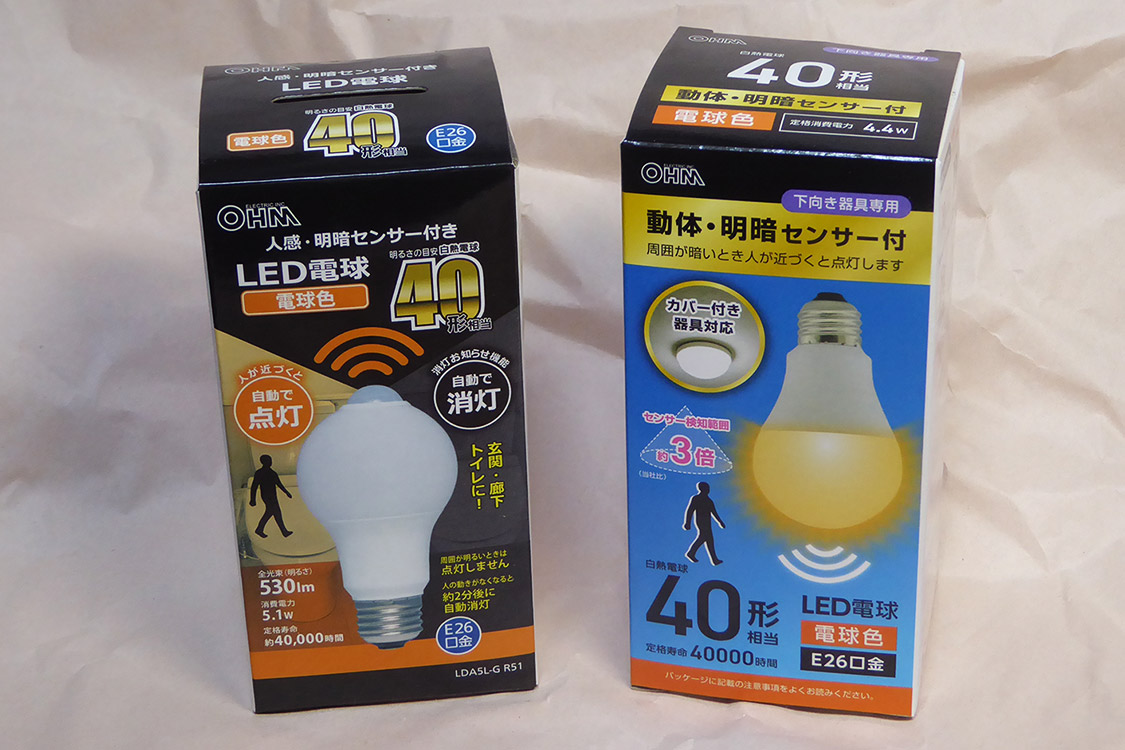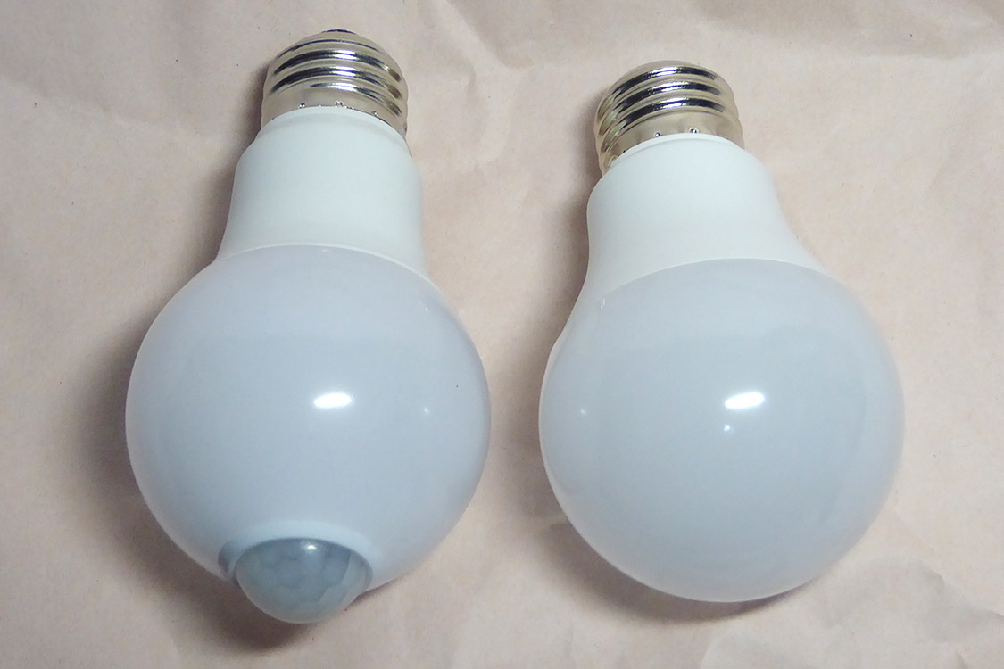 器具に取り付けるLED電球は、初めに写真右側の「動体・明暗センサー付LED電球 LDA4L-G-MW」。