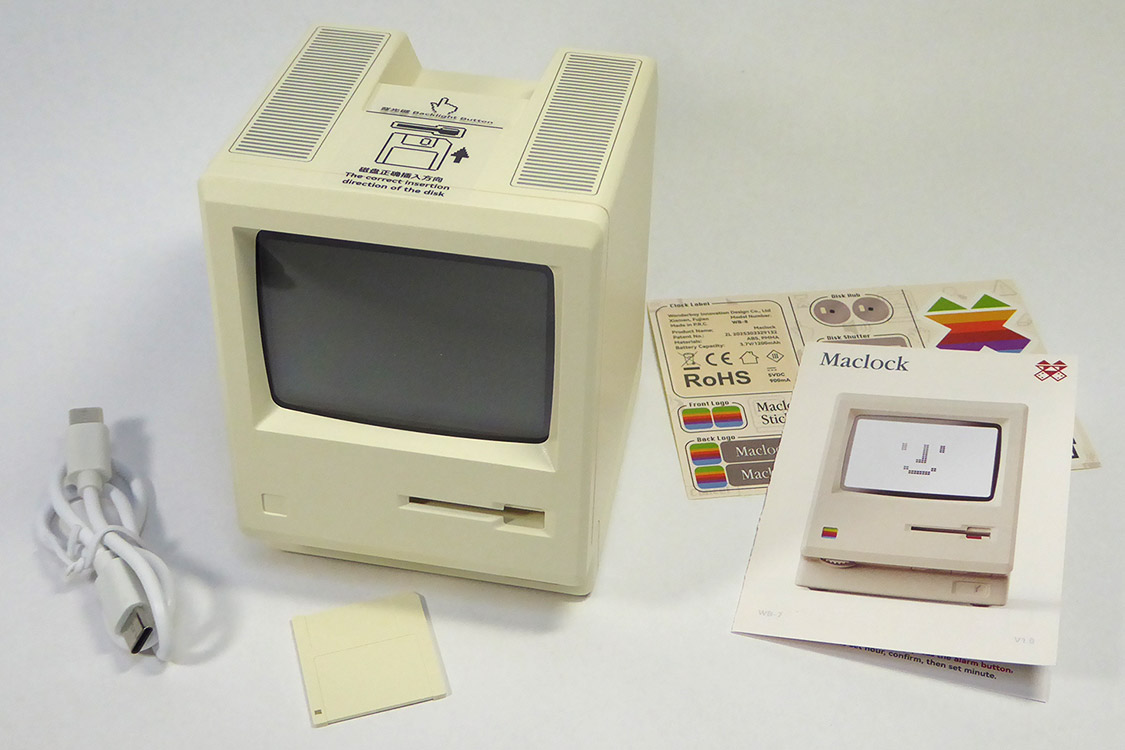 パッケージの中は、充電用のUSB-C to Aケーブル、Maclock本体、起動スイッチ用フロッピーディスク、日英対応取扱説明書と装飾用ステッカー。
