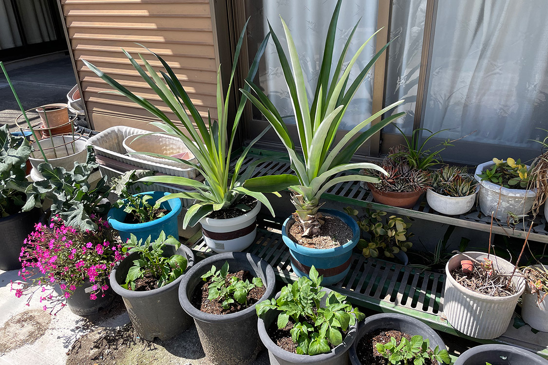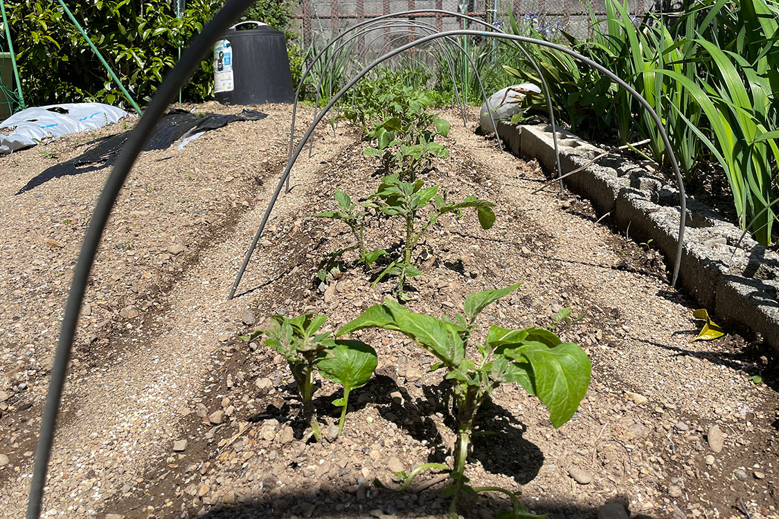鉢植えのじゃがいもはスペースの都合で畑に植えられなかったものを育てている。ホームセンターで種芋を購入すると1kg単位だったりするため余ってしまうのだ。