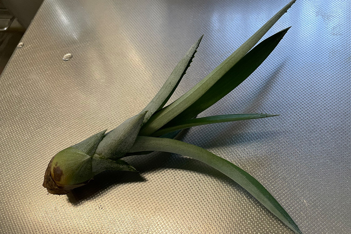 じゃがいもの鉢に囲まれて鎮座するパイナップル。