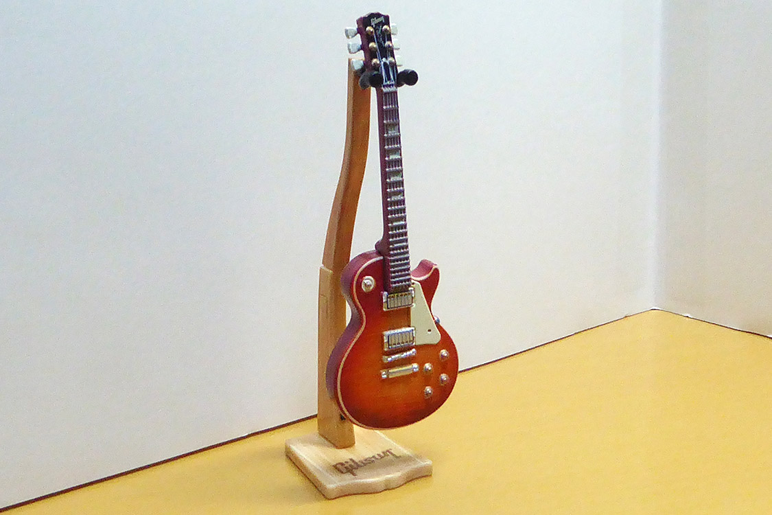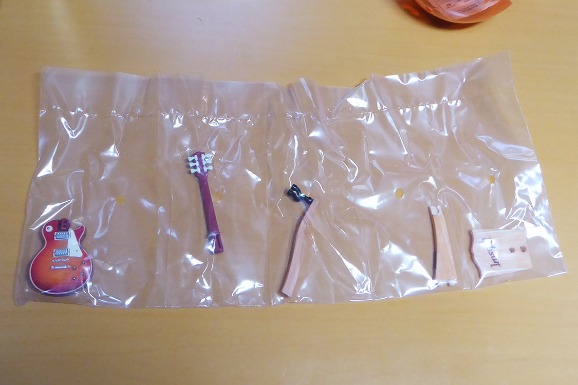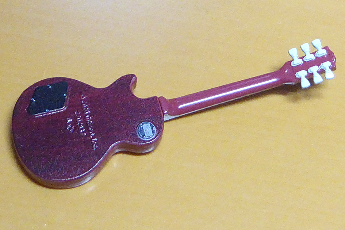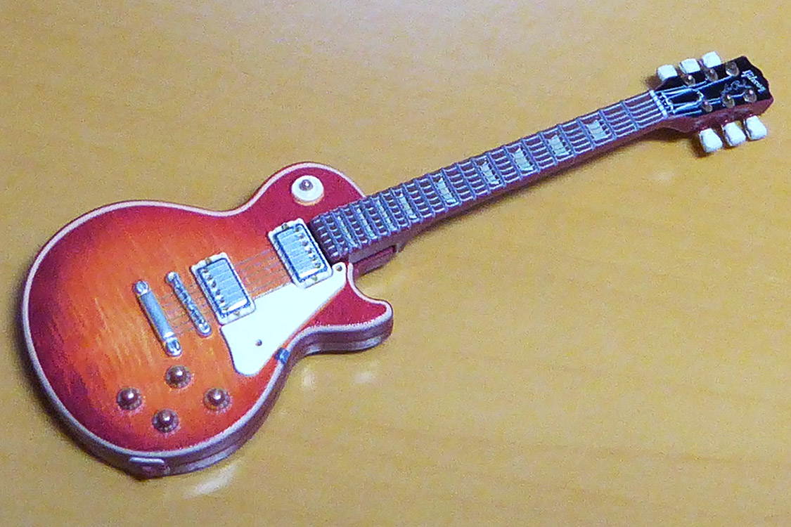 問題のガシャポンはバンダイから「Gibson Miniature Collection」として発売されたもので、「1959 Les Paul Standard」「1961 SG Standard」「1957 Les Paul Custom」「1958 Korina Flying V」「1961 ES-335」の5種類が12分の1スケールで再現されている。