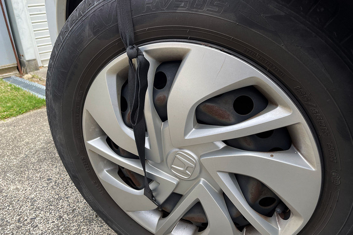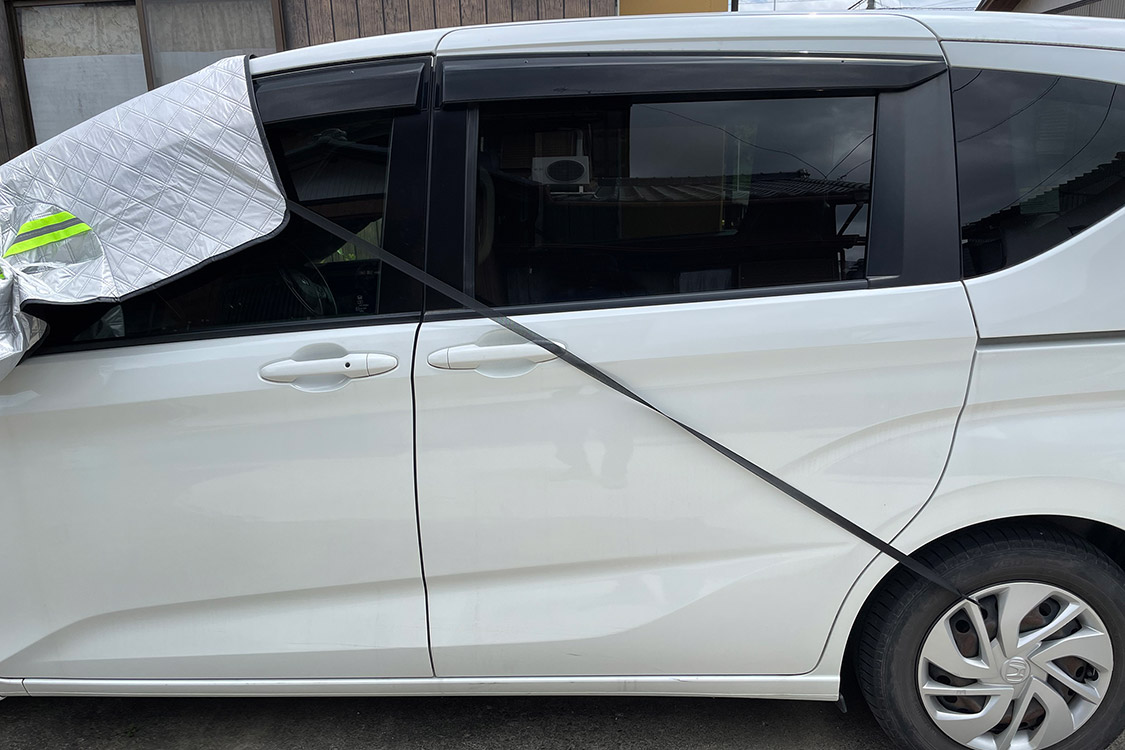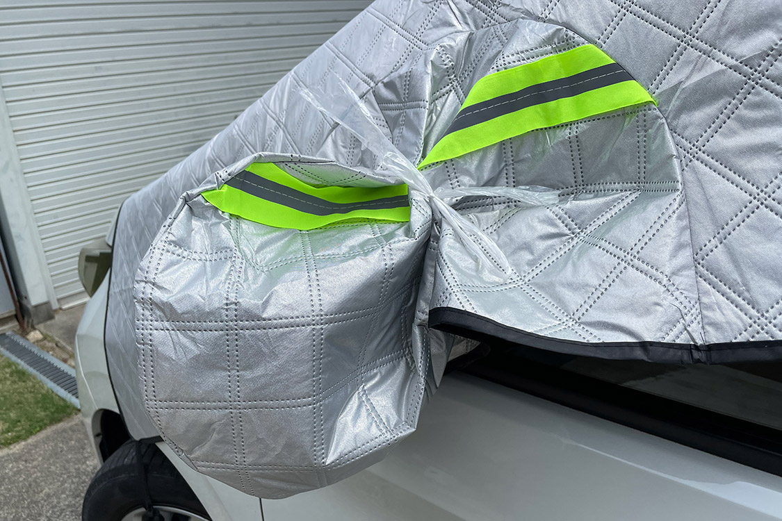 ドアミラーのカバーも商品ページの写真と異なっており、ただ被せるだけだとまくれ上がってしまうため、ビニールヒモで固定した。