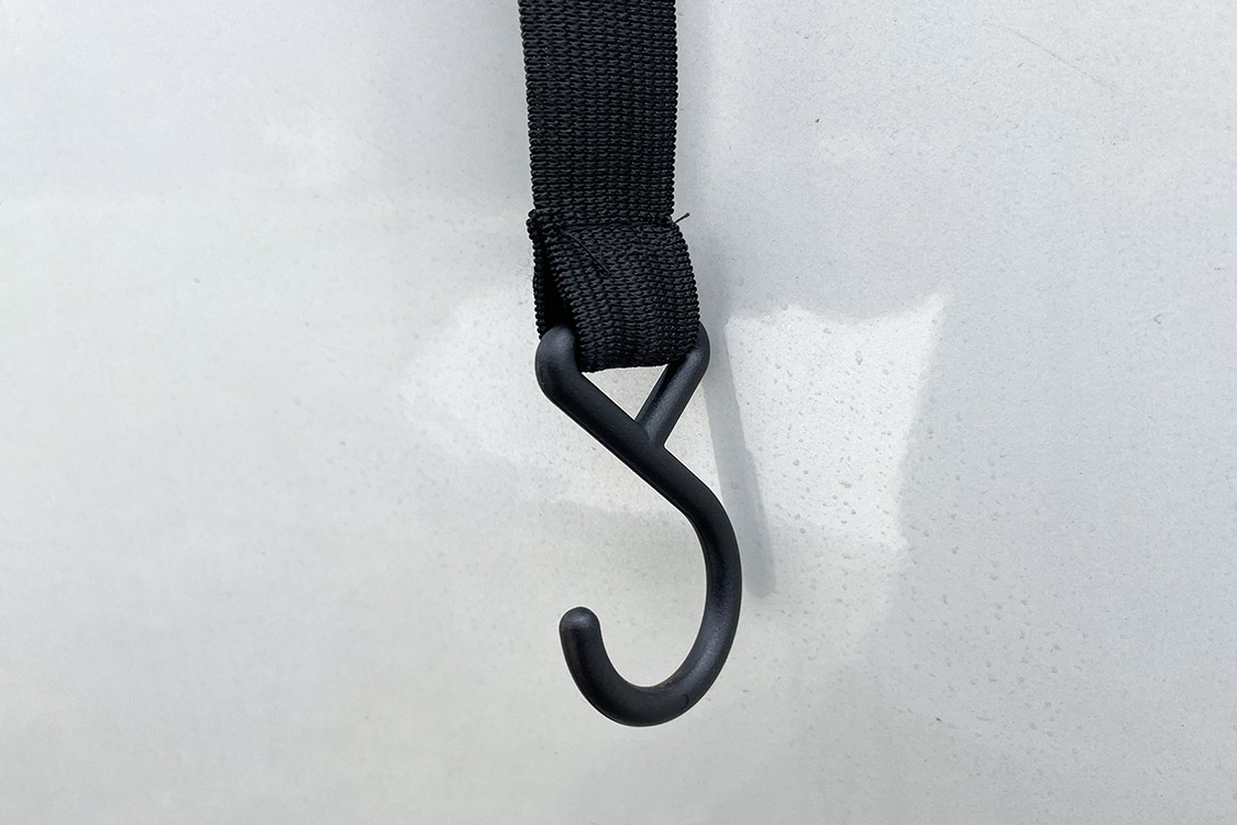 カバーの四隅にはプラスチック製のS字フックが先端に付いたバンジーコードが付いている。